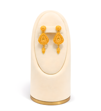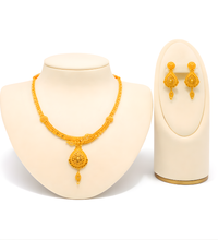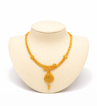 This 22KT necklace set weighs 23.6 grams, combining elegance with durability. Its high gold purity ensures resistance to tarnish, promoting longevity. Ideal for formal occasions, this set enhances aesthetic appeal while maintaining structural integrity, making it a valuable addition to any jewelry collection.