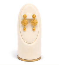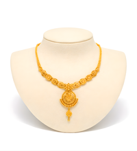 This 22KT necklace set weighs 24.5 grams, offering a substantial yet elegant design. The 22-karat gold ensures a high purity level, contributing to its durability and resistance to tarnishing. This set is an ideal choice for formal occasions, providing both sophistication and lasting value.